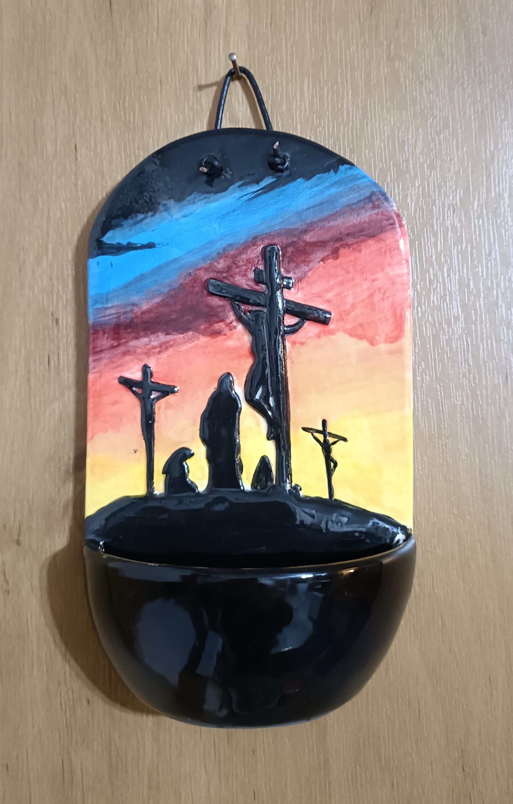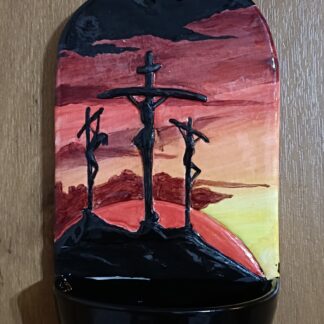 Hand Made Ceramic Holy Water font featuring Crucifixion on Calvary