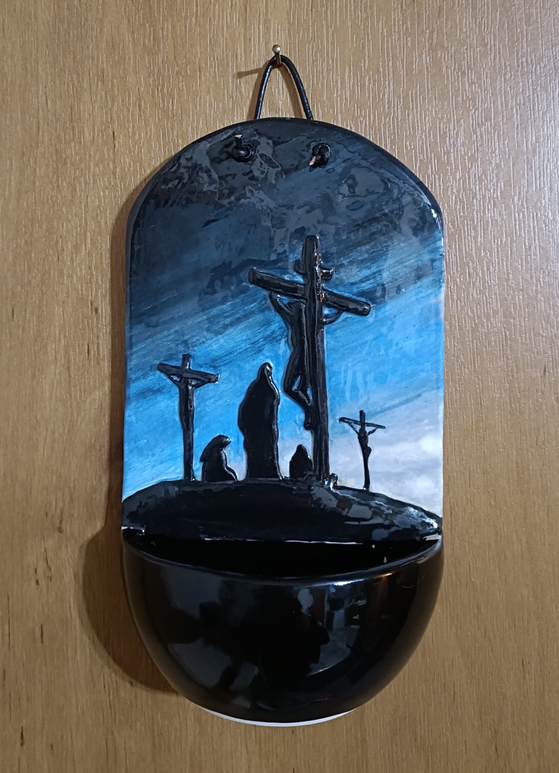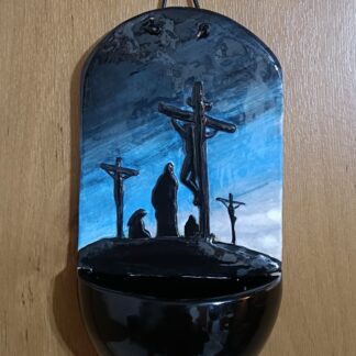 Hand Made Ceramic Holy Water font featuring Crucifixion on Calvary #1