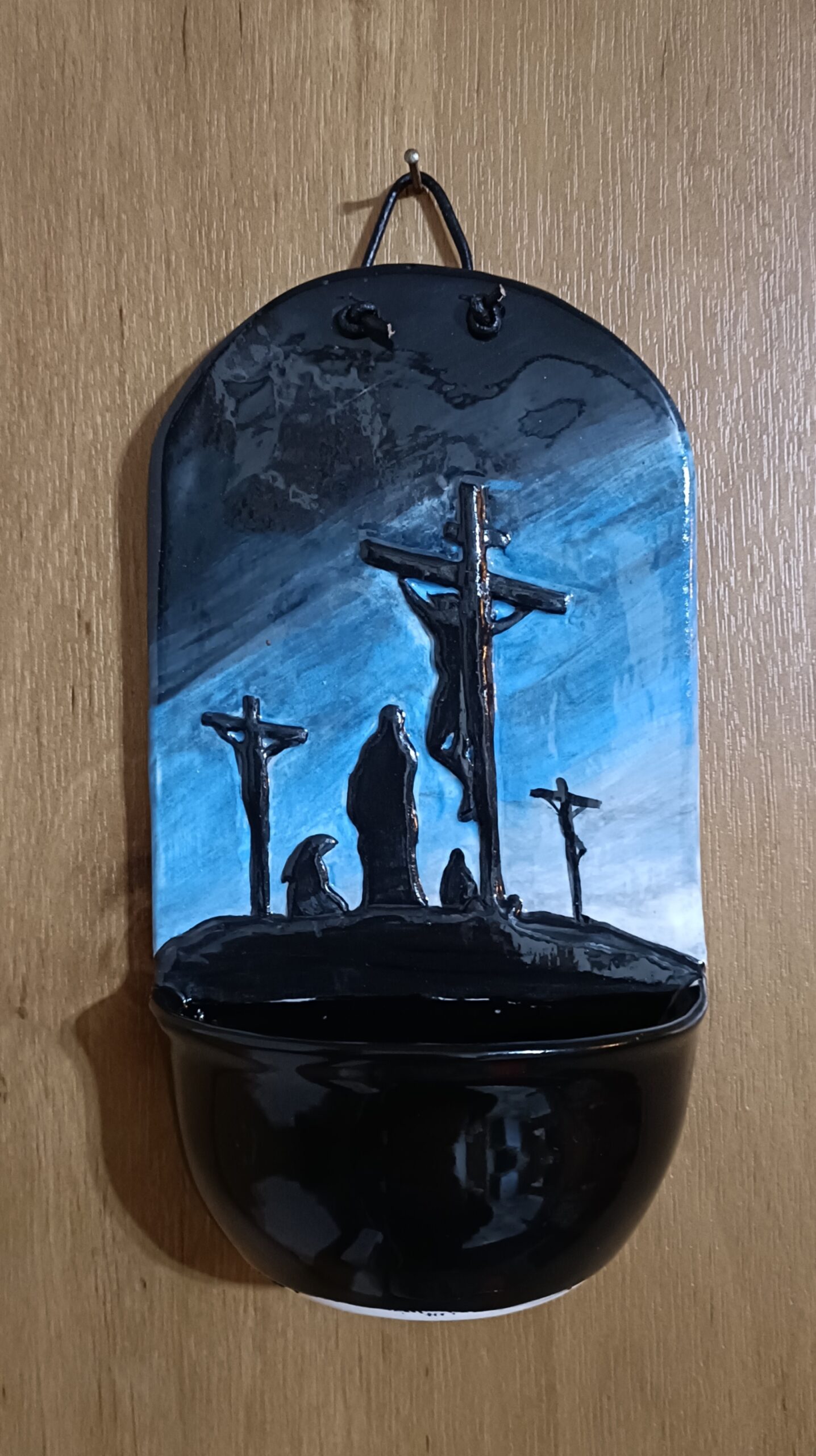 Hand Made Ceramic Holy Water font featuring Crucifixion on Calvary