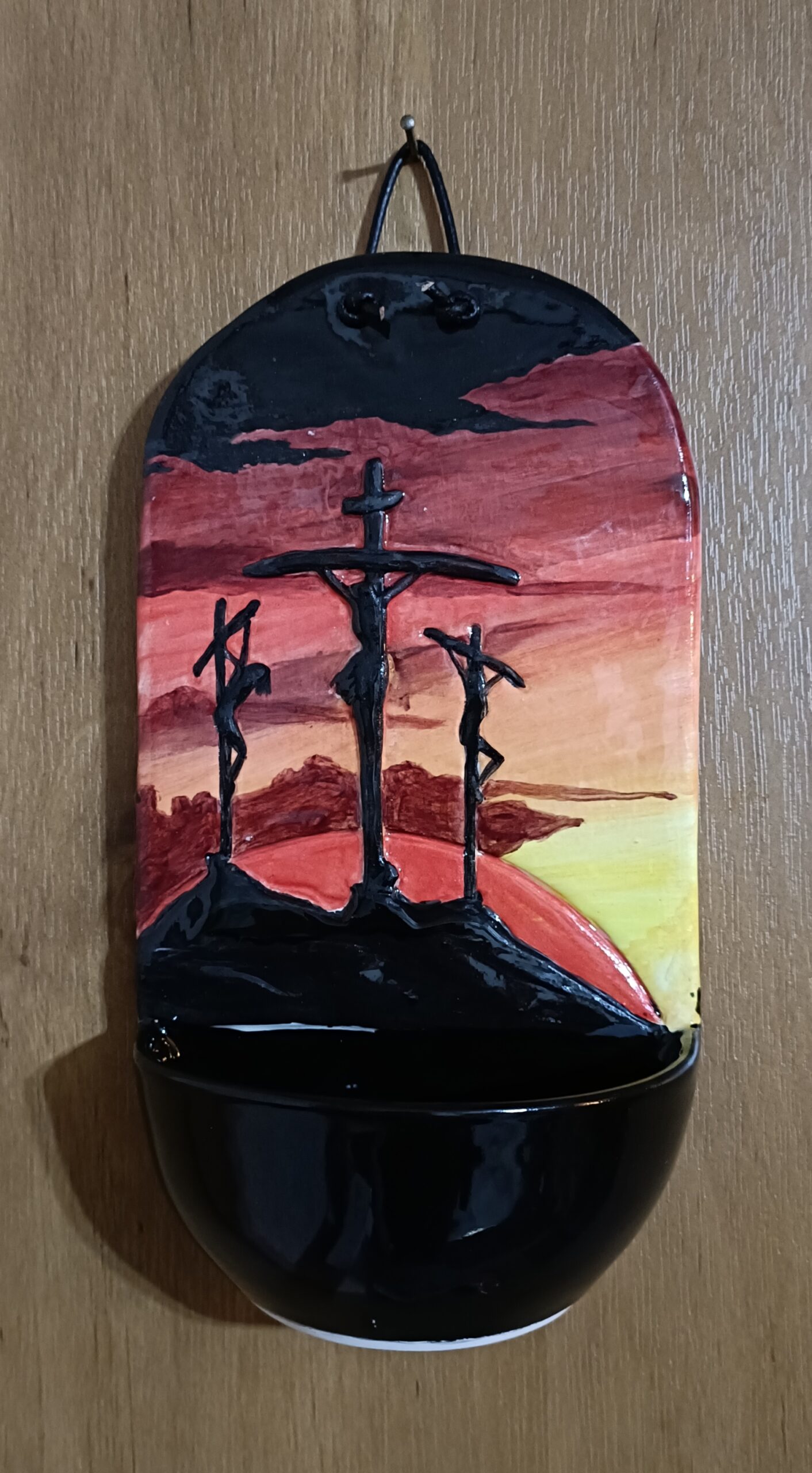 Hand Made Ceramic Holy Water font featuring Crucifixion on Calvary